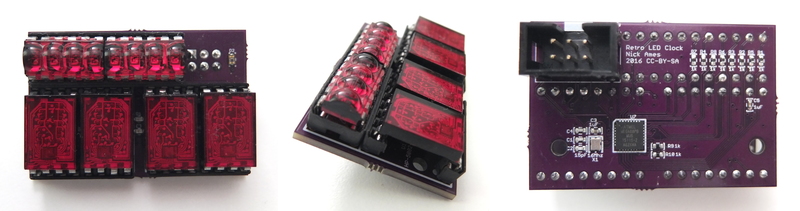 I really love the look of old Hewlett-Packard LED displays, so I used some to make a clock. This clock displays the time and date using dot-matrix displays and seven-segment "bubble" displays. Although they look pinkish in the photograph (since the color is outside the gamut of most monitors), the true color is a deep ruby red.